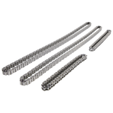 The COMP Cams Hi-Tech Timing Chain Sets for Ford Coyote engines are designed to withstand the stresses of upgraded, modified applications and are the perfect choice when replacing fatigued, worn out factory chains. Any time the cams are being upgraded in a Ford Coyote engine, or it is being built for high RPM racing use, replacing the tired, stock timing chains is a must. The new COMP Cams Hi-Tech Ford Coyote Timing Chain Sets feature heavy-duty secondary chains with 15% thicker plates than the factory chains, which helps to prevent common secondary chain failure. These kits also include premium quality primary chains that are ideal for any high performance or racing application. Whether simply upgrading camshafts or doing a full race engine build, these timing chain sets provide the durability needed in aggressive racing environments. Sets include two primary and two secondary chains.